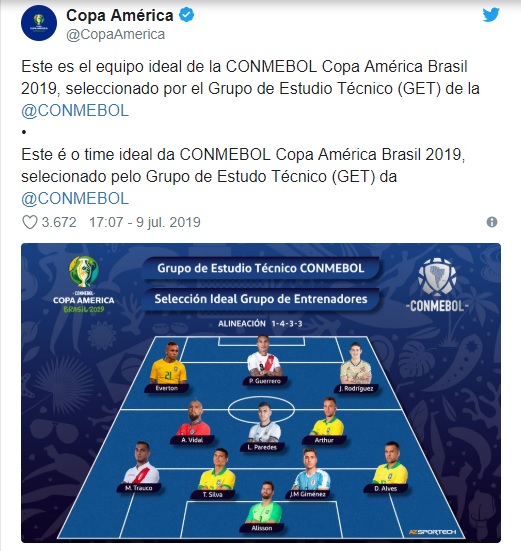 La Conmebol publicó en sus redes sociales su equipo ideal oficial de la Copa América, que culminó el domingo pasado con el título de Brasil, que derrotó 3-1 a una luchadora selección peruana.