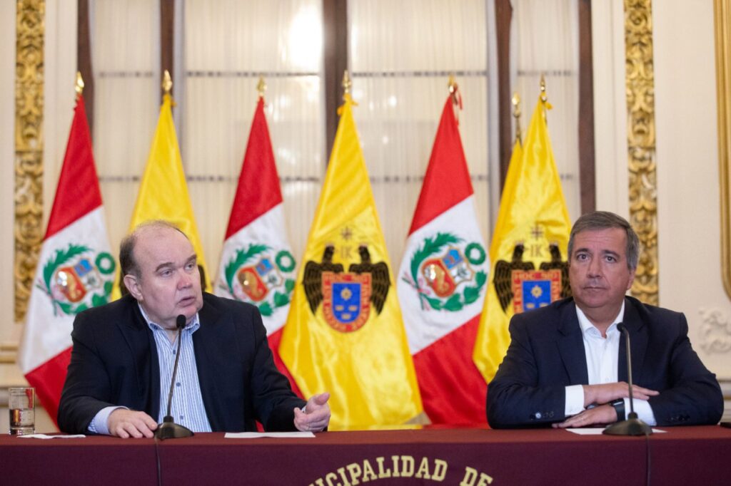 López Aliaga y Pérez Reyes ofrecieron esta tarde una conferencia de prensa tras la reunión que sostuvieron para encontrar mecanismos que permitan minimizar el impacto de la construcción de la Estación Central (E-13) de la Línea 2 no solo en la congestión vehicular sino en los negocios del centro de Lima.