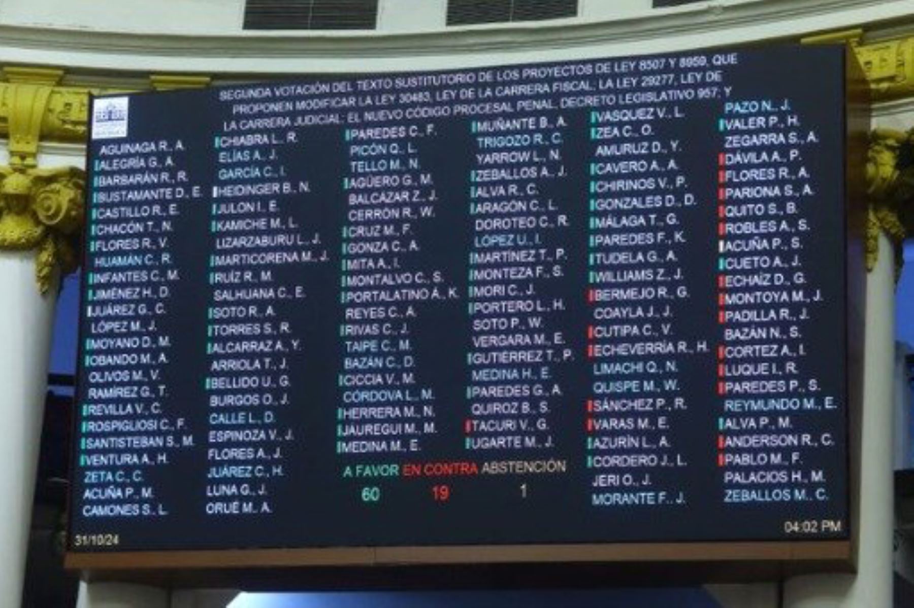 Lima, 31 Octubre 2024, (ANDINA).- El pleno del Congreso mandó al archivo el proyecto de ley para sancionar a fiscales y jueces que dejen en libertad a detenidos en flagrancia. La iniciativa legislativa no alcanzó los votos necesarios para ser aprobada en segunda votación.