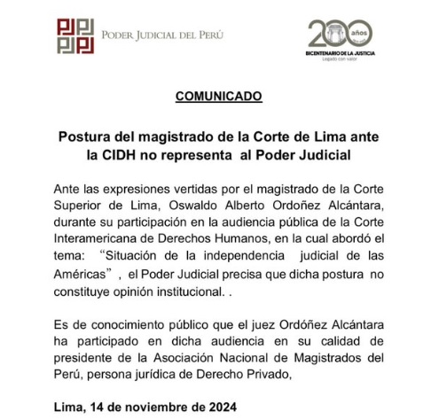 Lima, 14 Noviembre 2024, (ANDINA).- El Poder Judicial precisó que las expresiones vertidas por el magistrado de la Corte Superior de Lima, Oswaldo Alberto Ordoñez Alcántara, durante su participación en la audiencia pública de la Corte Interamericana de Derechos Humanos «no constituye opinión institucional».
