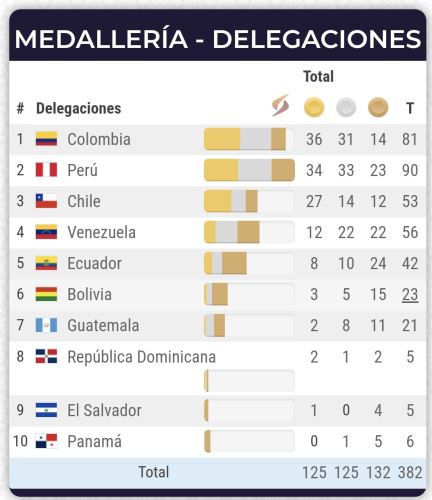 El cuarto lugar es para Venezuela con 56 (12 de oro, 22 de plata y 22 de bronce); quinto es Ecuador con 42 (8 de oro, 10 de plata y 24 de bronce) y el sexto lugar es para Bolivia con 23 (3 de oro, 5 de plata y 15 de bronce).