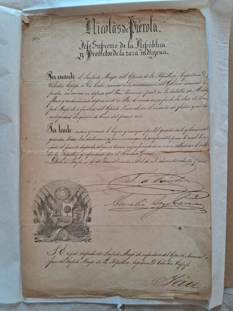 Entre estos últimos, resalta un documento expedido por el expresidente, Nicolás de Piérola, en abril de 1881, en el contexto de la guerra entre el Perú y Chile. En este documento se da cuenta del nombramiento de un sargento mayor de nacionalidad argentina, como sargento mayor de la Infantería del Perú, por su labor en la batalla de Miraflores, contienda ocurrida el 15 de enero del referido año.