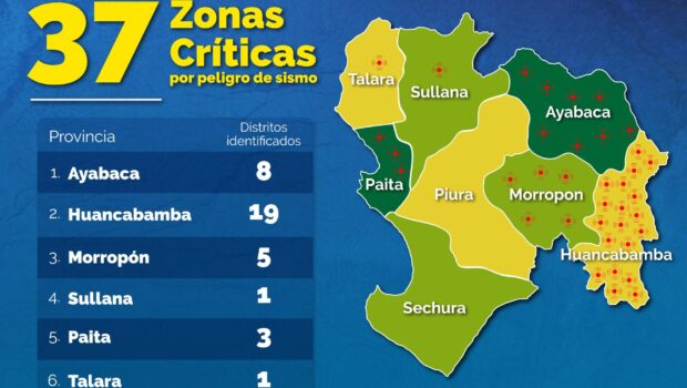 Según el Ingemmet, las 37 zonas de alto riesgo se ubican en las provincias de Ayabaca, Huancabamba, Morropón, Sullana, Paita y Talara. «Estas áreas son vulnerables a peligros geológicos como caídas de rocas, derrumbes, deslizamientos y erosión de laderas», subrayó.