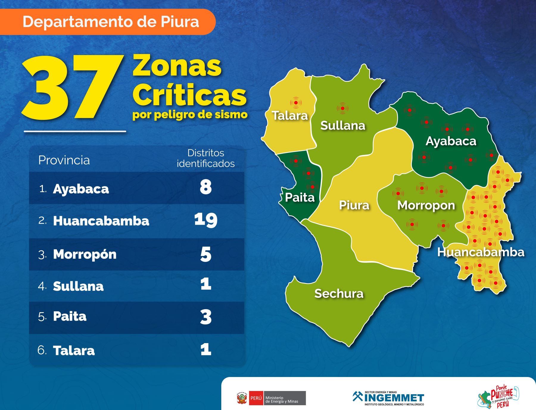 El organismo científico explicó que la mayoría de zonas críticas se encuentran situados en la provincia de Huancabamba con 19, seguido de Ayabaca (8), Morropón (5), Paita (3), Sullana (1) y Talara (1). En estos lugares el Ingemmet realizó evaluaciones geológicas, emitidas a través de informes que brindan recomendaciones específicas a las autoridades locales.