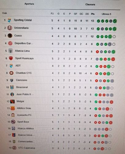 Lima, 11 Agosto 2025, (ANDINA).- A falta de un partido para que culmine la quinta fecha, Universitario y Cristal, que ganaron sus partidos, siguen batallando por el primer lugar del Clausura; Alianza Lima es quinto en busca de repuntar en sus próximos partidos.