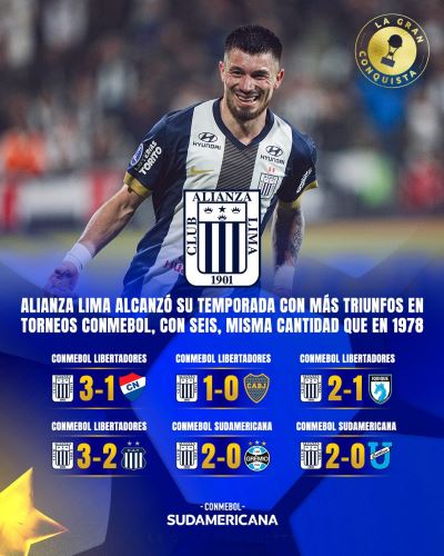 Lima, 14 Agosto 2025, (ANDINA).- La Confederación Sudamericana de Fútbol (Conmebol) resaltó la campaña internacional de Alianza Lima en el presente año porque lleva sumado seis victorias a equipos extranjeros, resultados que solo lo pudo lograr en la campaña de 1978.