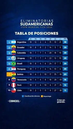 Argentina, que jugó este martes sin Lionel Messi, comandó el orden final de las selecciones clasificadas con 38 puntos. La siguieron Ecuador con 29, con 28 Colombia, Uruguay, Brasil y Paraguay para cerrar el privilegiado grupo que competirá en Estados Unidos, México y Canadá del 11 de junio al 19 de julio de 2026.