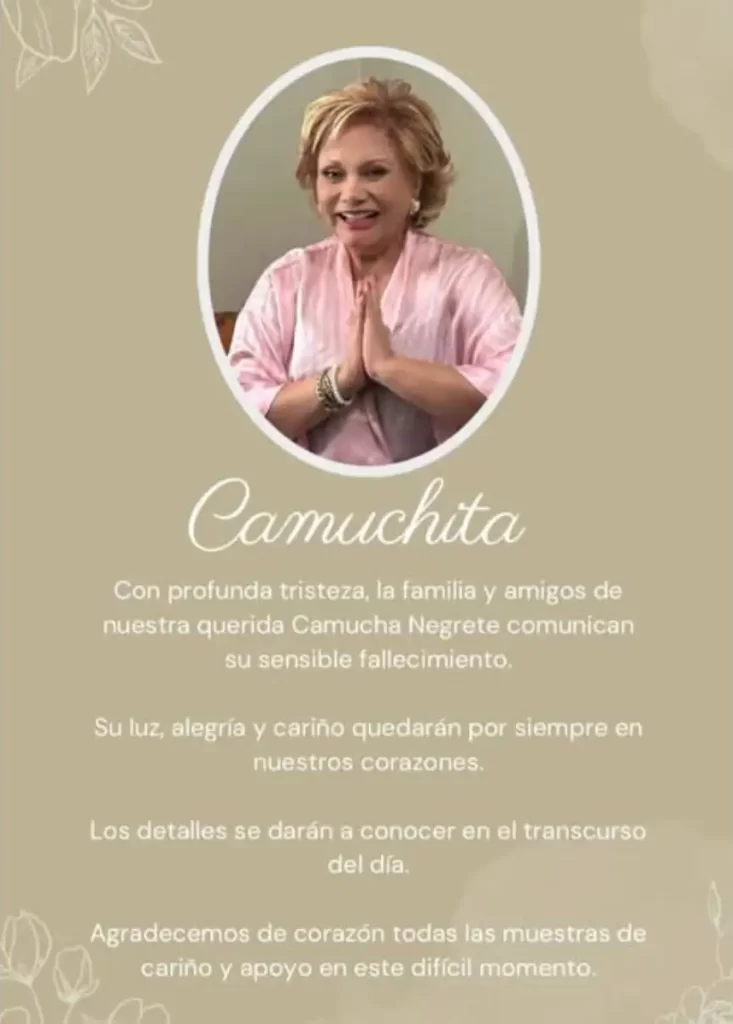 «Con profunda tristeza, la familia y amigos de nuestra querida Camucha Negrete comunican su sensible fallecimiento», señala la nota.
