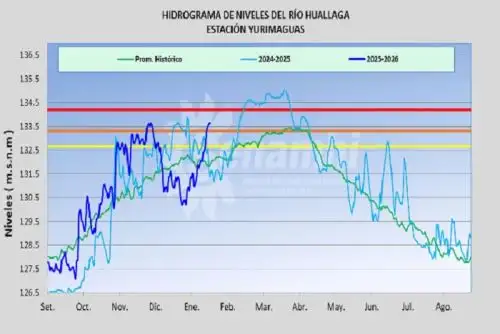 La estación hidrológica HLM Yurimaguas registró el 19 de enero un nivel de 133.63 metros sobre el nivel del mar (msnm), evidenciando una tendencia creciente. Esta estación es monitoreada por el Servicio de Hidrografía y Navegación de la Amazonía.
