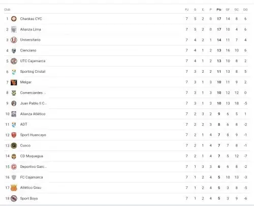 Lima, 15 de marzo 2026 (ANDINA).- La séptima fecha del Torneo Apertura movió la tabla de posiciones y pone cada día la Liga 1 más interesantes con equipos del interior del país exponiendo su poderío para darle pelea a los favoritos Alianza Lima, Universitario y Sporting Cristal.